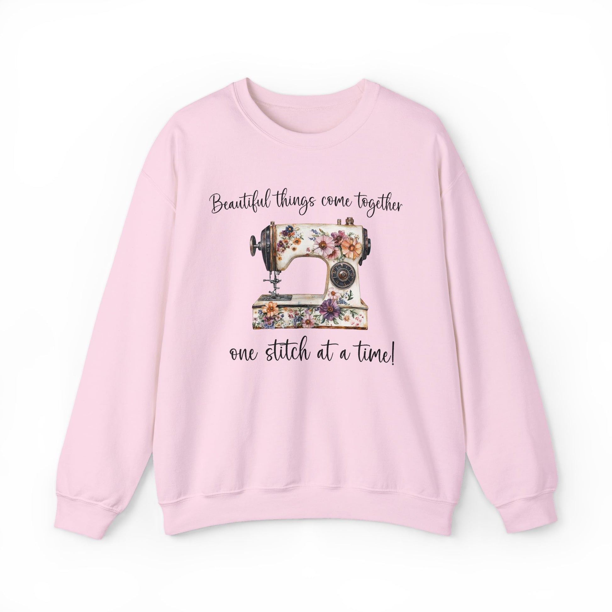 This cozy crewneck wraps a quiet, creative joy into soft, wearable comfort. A vintage sewing machine illustration, blooming with florals, sits at the center with the handwritten phrase “Beautiful things come together one stitch at a time.” It reads like a warm invitation to slow down and savor making — the kind of sweatshirt a stitcher pulls on during long afternoons at the sewing table, or to wear while teaching a friend how to thread a needle. The medium-heavy cotton-poly blend feels substantial without weighing you down; ribbed collar and cuffs hold their shape after many wears. Subtle details — tear-away label, clean tubular knit, and optional embroidered accents at chest or wrists — give it a refined, handmade-meets-quality finish. Ethically sourced cotton and OEKO-TEX dyes make it easier to feel good about wearing it.